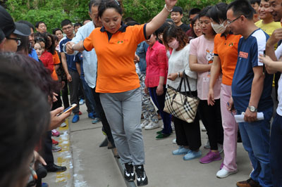 在广场赛道上进行了其它五项比赛,整个比赛过程精彩而激烈,在袋鼠接力赛与三人踏板赛中,虽然有队员摔倒,但他们仍然坚持将比赛进行到底,没有退出比赛。最有趣又有点难度的属“木头人过路障,过独木桥比赛”项目,魏董事长也参与其中,在半脚宽六米长的独木桥上,三人手拉手一起走过去才算赢,第一次比赛时全部掉下独木桥,在第二轮的重新比赛中董事长魏建功与他的团队以15.7秒的速度赢得了冠军,场内职工不断的呐喊助威,现场人声鼎沸,热闹非凡。