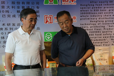 国家粮食局副局长徐鸣(左一)与集团公司董事长魏建功(左二)进行交谈