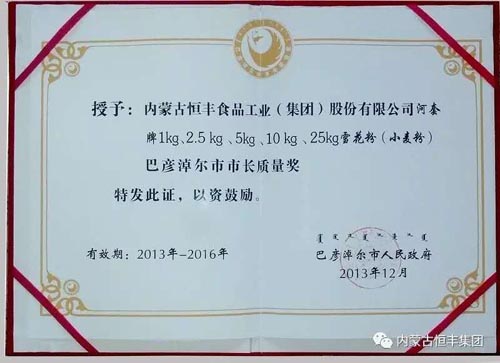 2013年获首届“巴彦淖尔市市长质量奖”。