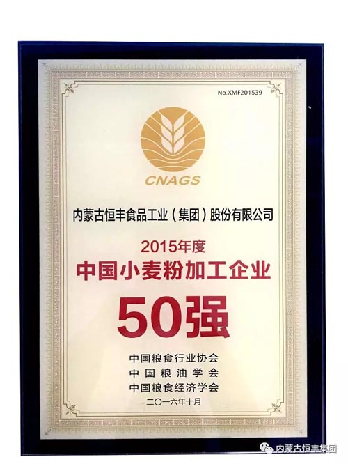 2015年度中国粮食行业协会“中国小麦粉加工企业50强”;