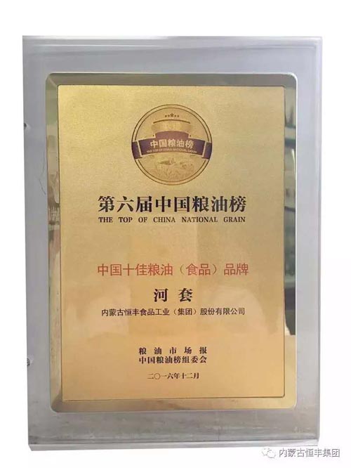 2016年“河套”品牌被中国粮油市场报评为第六届中国粮油榜“中国十佳粮油(食品)品牌”。